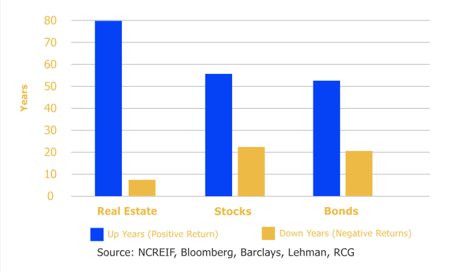 JP Morgan looked at the worst five-year periods for various investments from 1977-2012 and calculated total return (including cash flow). $100 invested in apartments at the beginning of the worst five-year period for real estate was worth $110 at the end. A portfolio of 60% stocks/40% bonds was worth $94 at the end of its worst five years.